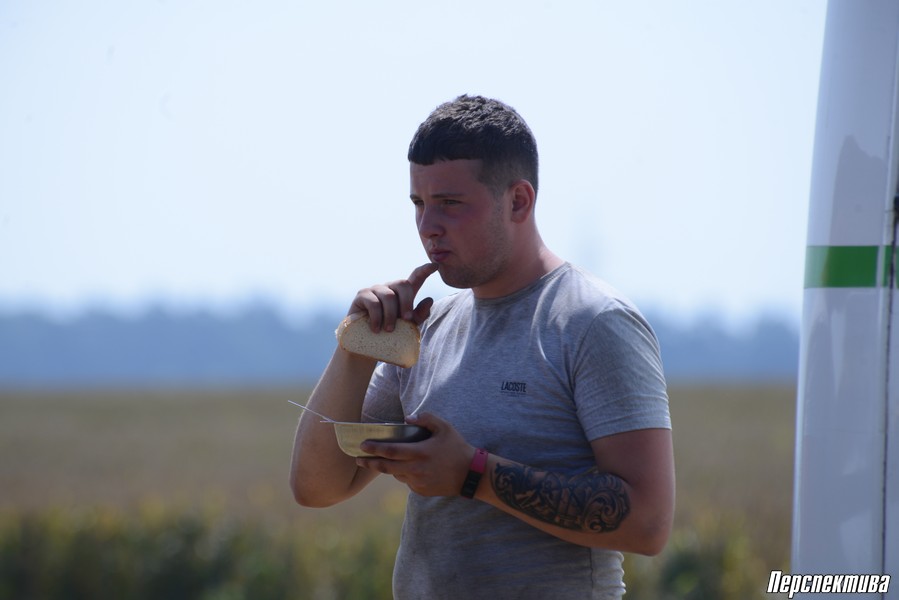 Пока мы разговаривали с молодым комбайнером, подъехал автобус: хлеборобам привозят обед. В меню в этот раз холодник, перловая каша, запеченное мясо и чай.